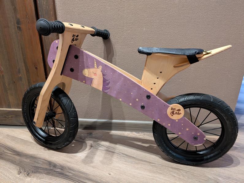 30 EUR. Pārdod lietotu koka līdzsvara divriteni Dip Dap bērniem vecumā līdz 5 gadiem. Sēdekļa augstums regulējams no 35cm līdz 43cm. Riteņi 12” pneimatiskās gumijas riepas ar metāla diskiem. Riteņa svars 3, 9 kg.