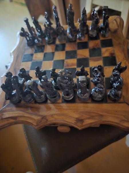 шахматная доска ручной работы, так же как и фигурки(отлиты в формах), один металл бронза, другой не знаю серебрянного цвета.,шахматы привезены из Морокко в 70-х годах прошлого столетия. шахматами не пользовались, стояли в секретере.О цене договоримся.