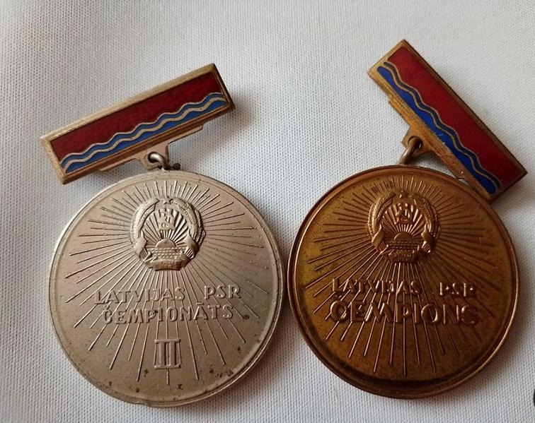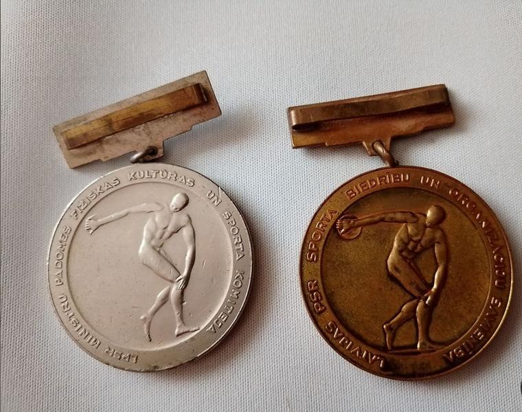 Ķengarags vai OMNIVA. - Fotogrāfijās redzamas sporta medaļas no Latvijas PSR laikiem, tas ir, perioda, kad Latvija bija Padomju Savienības sastāvā (1940–1991). Kas ir attēlots: Averss (pirmajā fotogrāfijā): attēlots atlēts–diskobols (sporta un olimpiskās kustības simbols). Kreisā medaļa (sudrabota): uzraksts «PSRS MINISTRU PADOMES FIZISKĀS KULTŪRAS UN SPORTA KOMITEJA» (Latvijas PSR Ministru padomes Fiziskās kultūras un sporta komiteja). Labā medaļa (bronzas/zelta tonī): uzraksts «LATVIJAS PSR SPORTA BIEDRĪBU UN ORGANIZĀCIJU SAVIENĪBA» (Latvijas PSR Sporta biedrību un organizāciju savienība). Reverss (otrajā fotogrāfijā): Abās medaļās redzams Latvijas PSR ģerbonis un uzraksti. Sudrabotā medaļa: «LATVIJAS PSR ČEMPIONĀTS II» → 2. vieta Latvijas PSR čempionātā. Zeltainā medaļa: «LATVIJAS PSR ČEMPIONS» → Latvijas PSR čempions (1. vieta). Augšējās plāksnītes rotātas ar emalju Latvijas karoga krāsās ar viļņotu zilu joslu (simbolizē jūru). Izsniegšanas periods: Šādas medaļas tika pasniegtas Latvijas PSR republikas čempionātu uzvarētājiem un laureātiem apmēram 1960.–1980. gados. Kolekcionāra vērtība: Cena ir atkarīga no: saglabātības (redzamas oksidēšanās pēdas, bet kopumā stāvoklis ir labs), retuma (zelta čempionu medaļas sastopamas retāk nekā sudraba prēmiju medaļas), pieprasījuma starp sporta vai padomju apbalvojumu kolekcionāriem. Aptuveni: Sudrabotā (II vieta): 15–30 € Zeltainā (čempions): 25–50 € Padomju medaļu izsolēs Latvijā un Krievijā cenas dažkārt var kāpt augstāk, ja gadās ieinteresēts kolekcionārs.