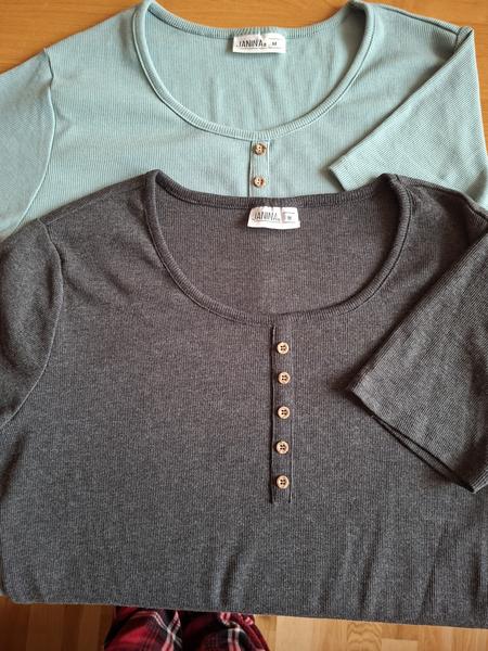 Divi T- krekliņi, M izmers (uz 42.), miksti, kā trikotāža. 55% kokvilna 45% poliesters. Pirkti Austrijā, KIK.. tumši pelēks un tirkīzzaļš. Nav valkāti. Abi kopā 6 eiro.Varu nosūtit.