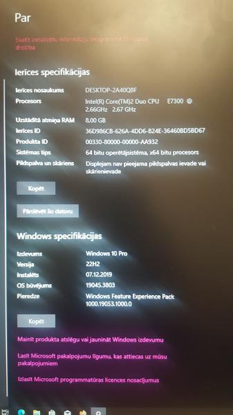 Pārdodu lietotu stacionāro datoru ikdienas lietošanai. Cena tāda tika ja paņem šodien uzreiz. Specifikācija: Procesors: Intel Core Duo E7300 Operatīvā atmiņa: 8 GB DDR2 Diski: SSD 64 GB (Windows un programmām) + HDD 1 TB (datiem) Videokarte: NVIDIA GeForce GT 240, 1 GB Operētājsistēma: Windows 10 (uzinstalēts, gatavs lietošanai) Piemērots: internetam, e-pastam filmām, YouTube MS Office / dokumentiem vecākām spēlēm Dators strādā korekti, nav jauns, bet ikdienas uzdevumiem pilnībā lietojams. SSD nodrošina ātrāku sistēmas startu, savukārt 1 TB disks – pietiekami daudz vietas failiem. Komplektā: sistēmbloks, monitors, tastatūra, pele un visi nepieciešamie vadi. Pieslēdz un lieto! Cena 15 eiro