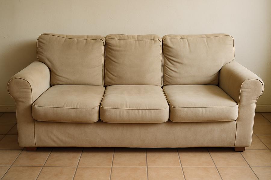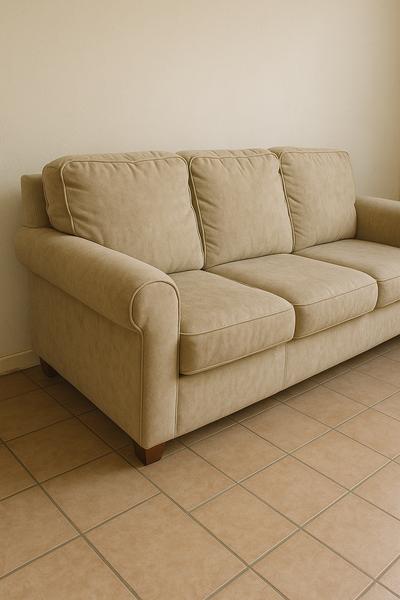Trīsvietīgs bēšs dīvāns, izcili iederēsies jebkurā dzīvojamajā istabā. Atdod, jo tika iegādāts jauns.