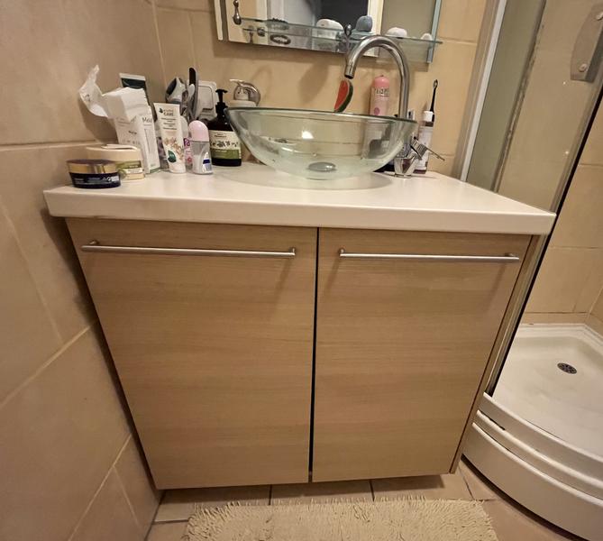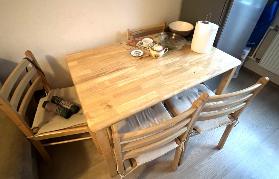 Lietota virtuves iekārta ar gāzes plīti un krāsni; skapis ar spoguli; 2 skapīši; kafijas galdiņš; koka galds ar 4 kresliem; sekcija