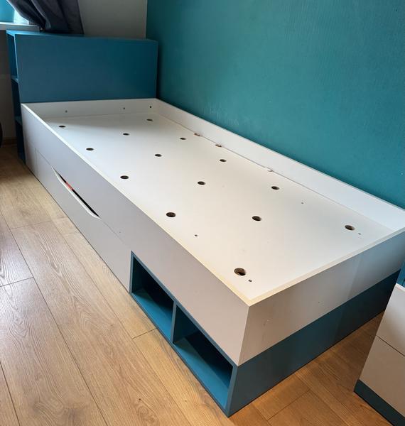 Ar defektiem. Gulta, bet dēlis, uz kura turas matracis salauzts(jāmaina) nepieciešams vnk jauns, Stūra skapis, nav 1 durvis, komplekts. Klāt ir pārdošana skolas galda un grāmatu plaukts otrā sludinājumā. Pašizvešana, izmērus varu nosūtit pa tiešo
