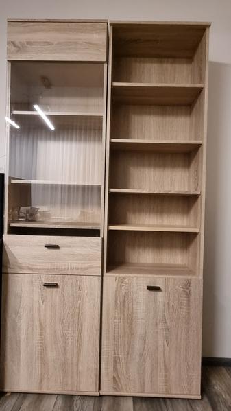 Divi plaukti AxPxD 157x50x28, ļoti labā stāvoklī, tikai vienam uz sāna ir neliels lamināta noberzums. Un divi piekarāmie skapīši, nelietoti